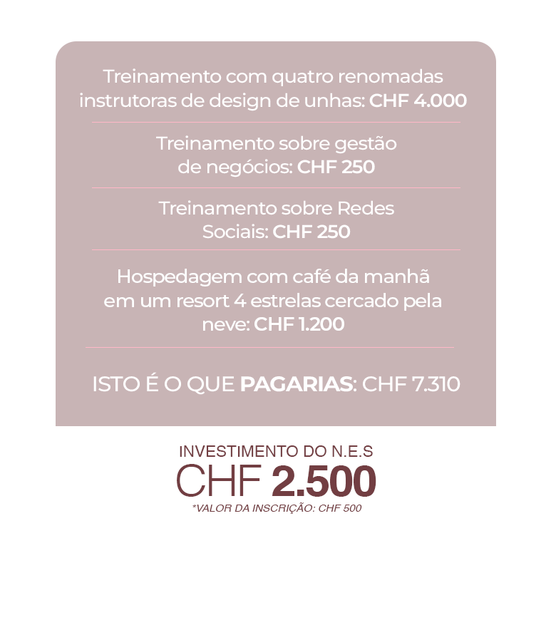 O valor da inscrição é de 500 CHF, e este montante é totalmente deduzido do valor total da mensalidade do programa. A inscrição garante a tua vaga no Nails Experience Swiss, um evento premium e exclusivo, com vagas limitadas e seleção criteriosa das participantes.